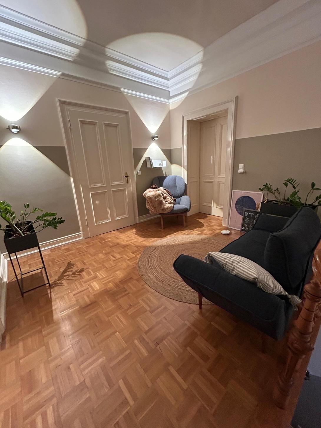 Im zweiten/ obersten Stock meines Hauses biete ich ein wunderschönes Zimmer mit Parkettboden. Es ist mit einem Bett, einem Schreibtisch und einem grossen Regal/ Staufläche ausgestattet. Es gehört ein grosses, eigenes Bad dazu (Dusche und Badewanne) und es kann ein gemütlicher "Wohnflur" mitgenutzt werden...